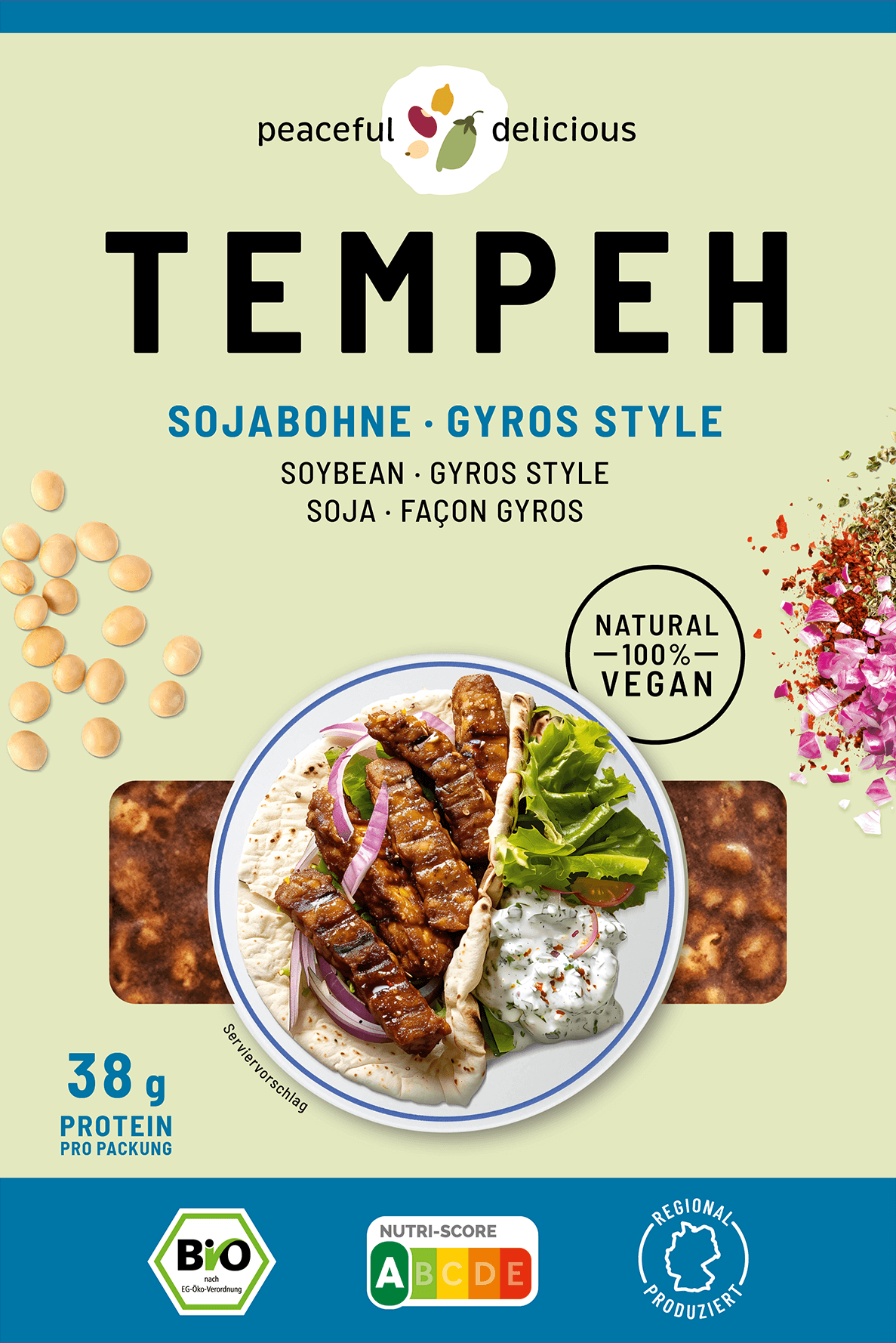 Soybeans* cooked 90 %, water, sea salt, spice mix* (oregano, lovage, chives, nettle, pepper, peppermint, nasturtium, tarragon), cane sugar*, potato starch*, Rhizopus starter culture.